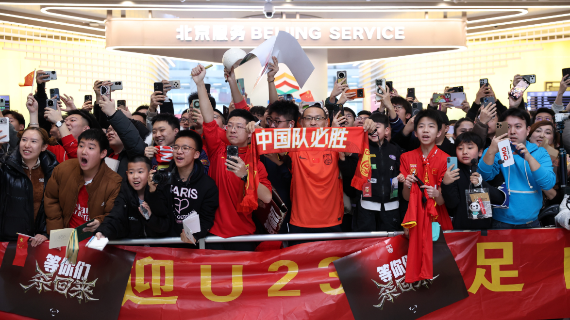 “青春无悔,国足扬威!欢迎英雄凯旋!”1月26日下午,北京大兴国际机场国际到达大厅,在球迷们的呐喊声和欢呼声中,U23国足队员戴着花环从抵达通道走了出来。一天前,他们在沙特举行的2026年U23亚洲杯中斩获亚军,创造了球队在该项赛事中的历史最佳成绩。