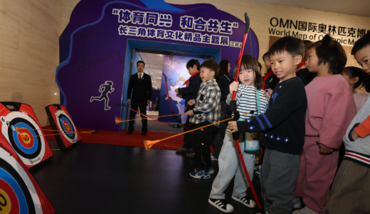 体育强则中国强,国运兴则体育兴。体育不仅是社会发展与人民幸福生活的重要组成部分,也是推动长三角一体化发展的重要纽带。展览聚焦“体育同兴、和合共生”主题,集中展示了长三角地区体育历史文物、影像资料、冠军藏品等珍贵内容,呈现了体育在推动区域协同、增强文化自信方面的独特作用。展览现场,来自南京青奥村小学和建邺实验幼儿园的学生们作为首批观众,通过参观“沪上明珠”“金陵风华”“钱塘潮涌”“徽韵皖风”四大板块内容,仔细领略长三角体育历史与文化特色,同时沉浸式体验了投壶·礼射传承、射箭·古今融合、冰壶·趣味竞技、篮球·青春联动等多项互动活动,感悟体育文化魅力,享受体育运动带来的欢乐。一位参与活动的学生兴奋地表示:“原来体育不只是比赛,还有这么多有趣的历史和文化。”