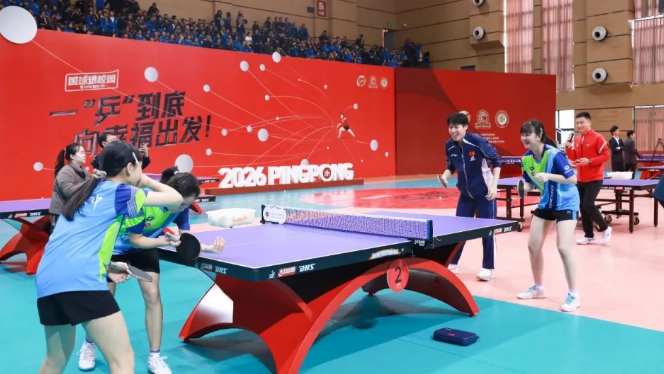 在重庆八中体育馆,国家队教练王皓、孙逊带领王楚钦、梁靖崑、向鹏等运动员与师生互动交流,推动体教融合发展。活动现场,梁靖崑、向鹏在“大小台”趣味对抗赛互动中与重庆八中乒乓球队队员、嘉宾同台竞技;周启豪、徐瑛彬与AI智能乒乓设备展开新奇对决。
