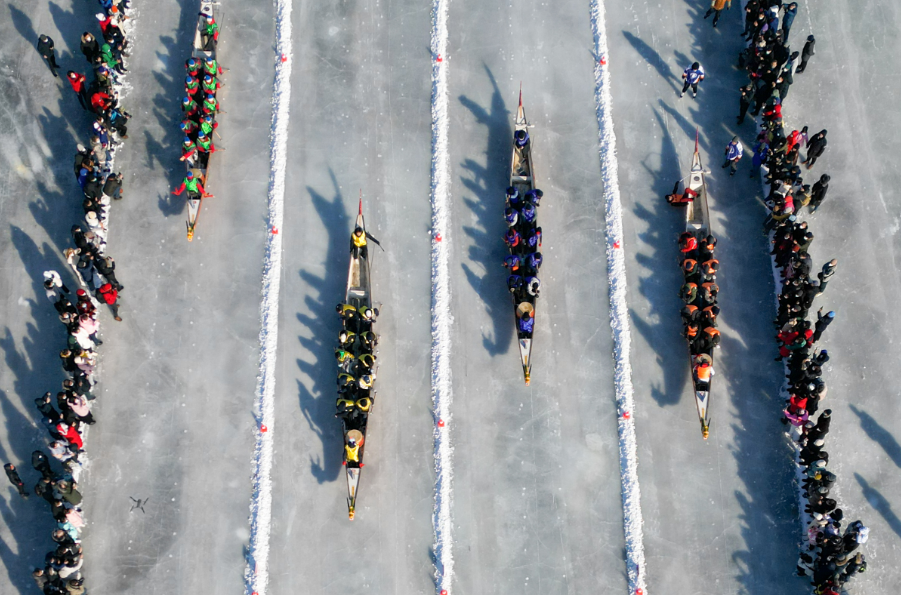 1月1日,2024年中国首届冰上龙舟公开赛在黑龙江大庆市万宝湖开赛。参赛队员们喊着口号、和着鼓点,有节奏地在冰面上奋力划动,场面非常热闹。有选手赛后感慨,“谁说龙舟只能在水上玩,对于我们东北人来说,龙舟给我们带来的是冬天的快乐。”