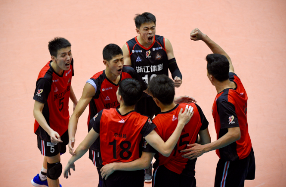 在3比2险胜上届冠军江苏男排之后,浙江男排的球员们兴奋地抱在一起。在27日进行的这场全国男排锦标赛半决赛中,浙江男排“00后”接应刘浩男经受住了考验,把握住了机会,证明了自己。