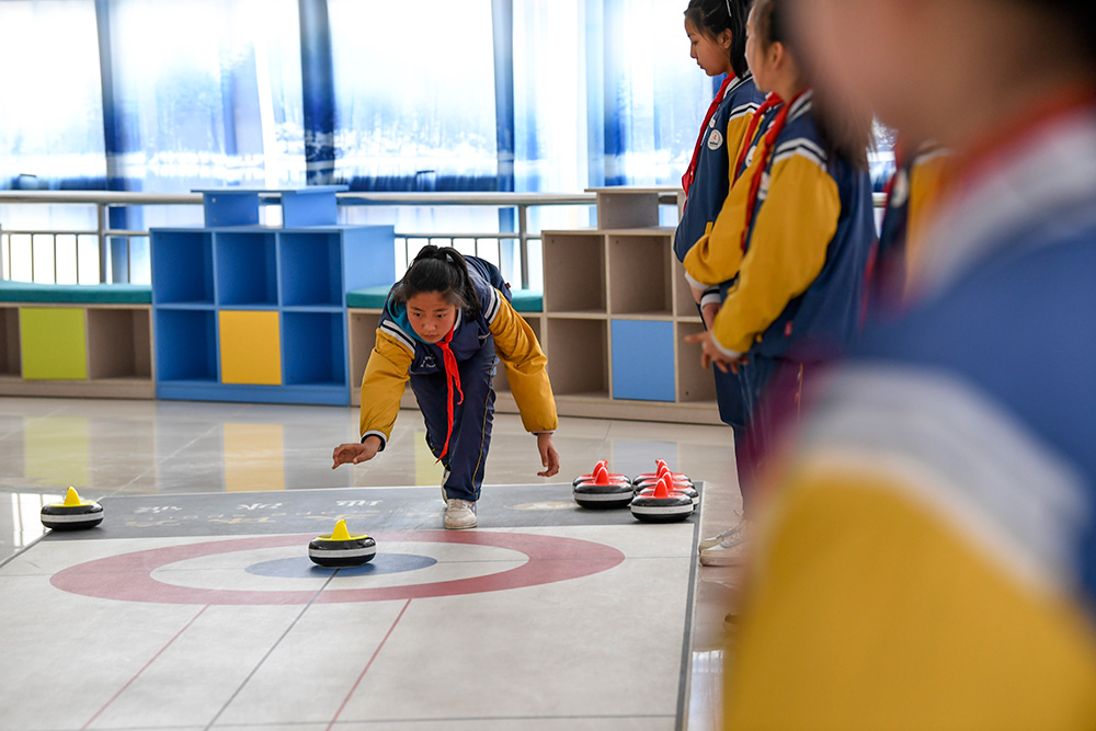 学校将“旱地冰壶”纳入体育课程,保证学生每天参与冰壶运动1小时。通过观看视频、教师讲解、动作示范等方式,让全体学生认识冰壶颜色、区分运动区域、了解计分规则等基本知识,引导学生积极参与训练,体会冰壶运动的乐趣。